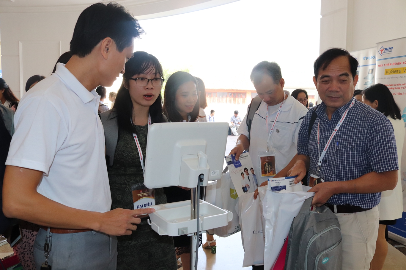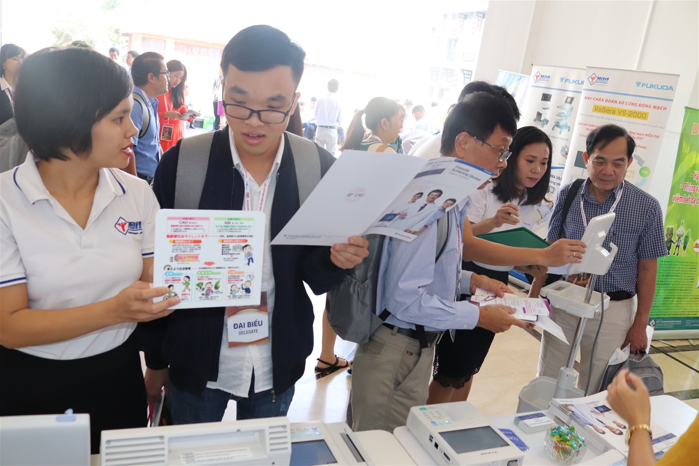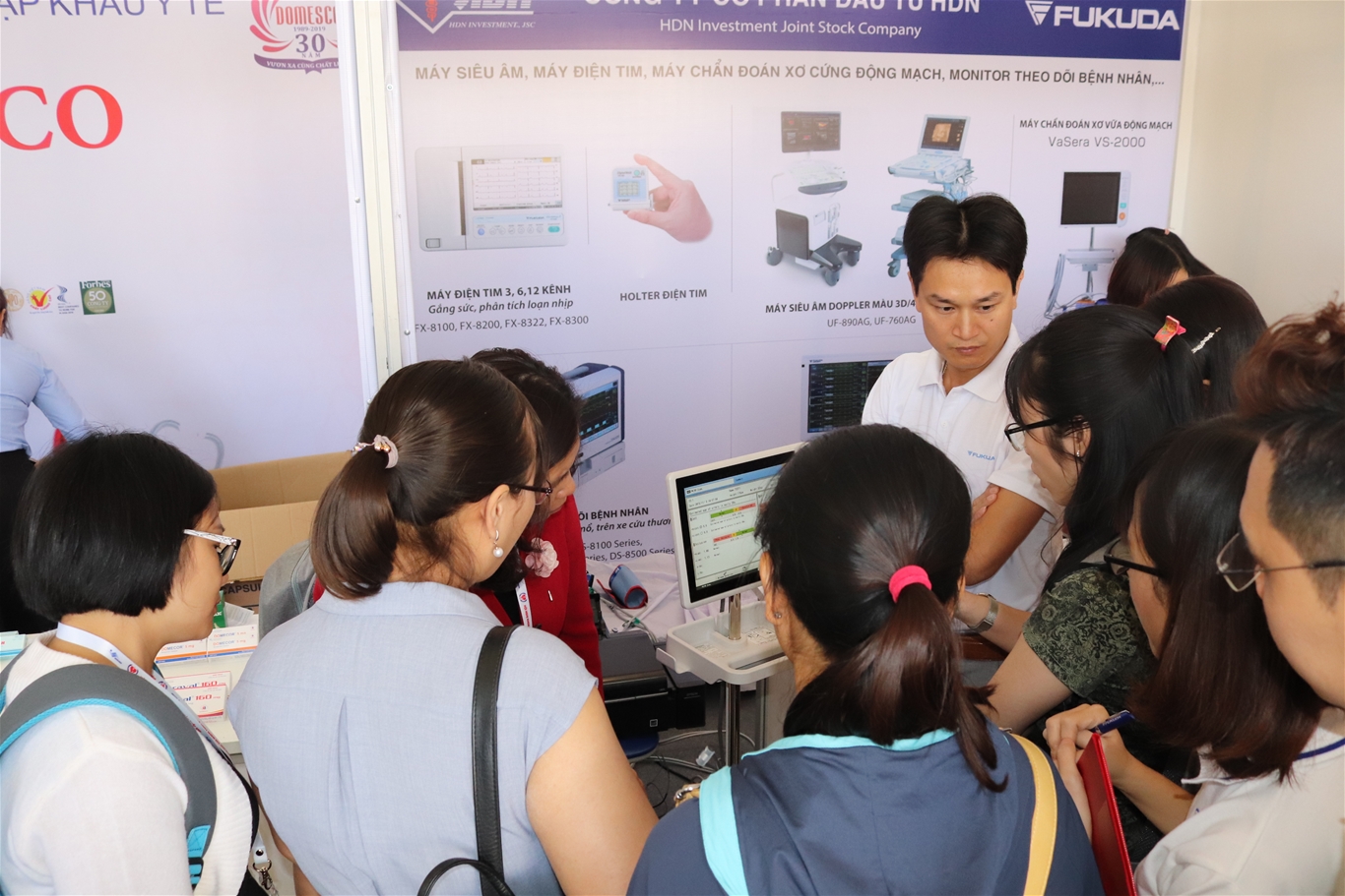 Tham gia hội nghị lần này, gian hàng của Công ty CP đầu tư HDN đã trưng bày và giới thiệu các sản phẩm hỗ trợ thăm khám để tầm soát bệnh tim mạch như máy chẩn đoán xơ cứng động mạch không xâm lấn - Vasera VS2000, máy siêu âm, máy điện tim Fukuda,...