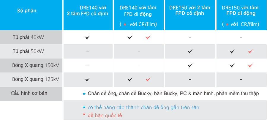 - Clear Vision DRE 140/150: Cột chụp đứng, Cột mang bóng, Bàn bệnh nhân 4 hướng, 1 hoặc 2 tấm cảm biến